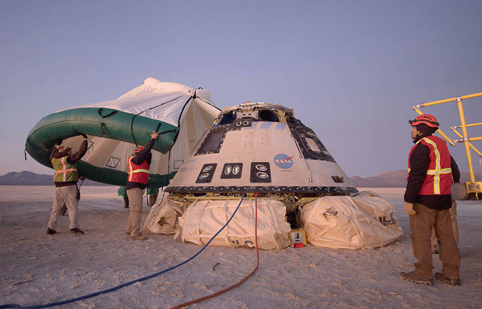 बोइंग के इंजीनियरों ने प्रशांत महासागर में उतरने की योजना बनाई, पैराशूट लैंडिंग से धीमा और रेगिस्तान में अपनी लैंडिंग को आरामदायक बनाने के लिए एयरबैग स्थापित किया,