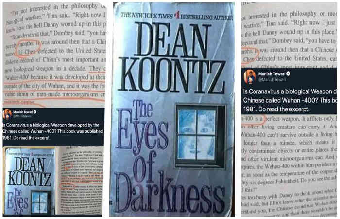@DarrenPlymouth ने वुहान -400 वायरस का हवाला देते हुए ट्विटर हैंडल से इस उपन्यास में लिखी एक लाइन साझा की है। यह ट्वीट सोशल मीडिया पर तेजी से वायरल हो रहा है और लोग इस पर प्रतिक्रिया दे रहे हैं।