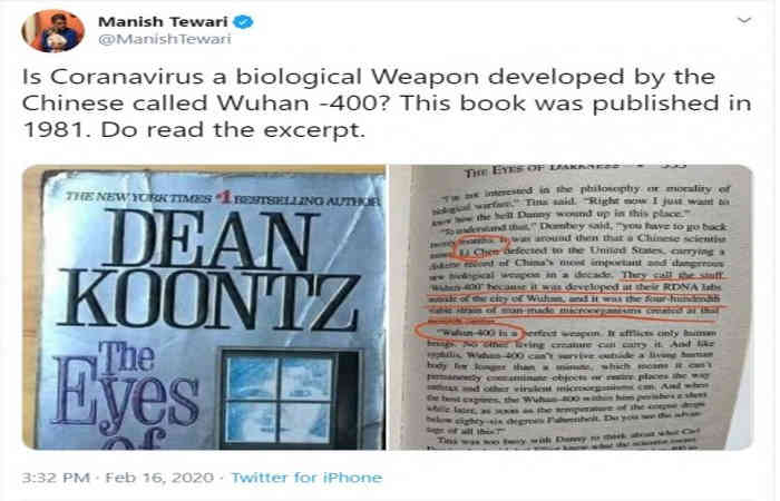 कांग्रेस नेता मनीष तिवारी ने भी किताब का एक हिस्सा साझा किया और लिखा, 'क्या चीन के वुहान -400 द्वारा विकसित कोरोनोवायरस एक जैविक हथियार है? यह पुस्तक 1981 में प्रकाशित हुई थी। इस पैराग्राफ को पढ़ें। '