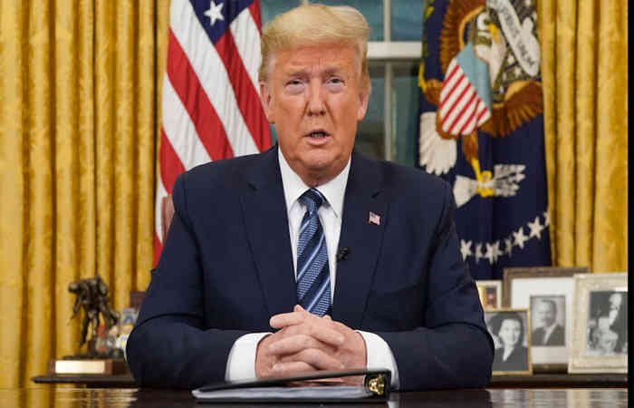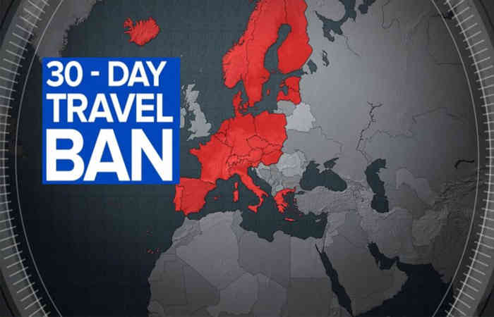 अमेरिकी राष्ट्रपति डोनाल्ड ट्रम्प ने कोरोना वायरस या COVID-19 संक्रमण के संबंध में सभी यूरोपीय देशों से 30 दिनों के लिए संयुक्त राज्य अमेरिका की यात्रा पर प्रतिबंध लगा दिया है। ट्रंप ने कहा कि यह कदम देश में वायरस से जुड़े नए मामलों को रोकने के लिए उठाया जा रहा है।