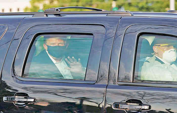 अचानक ट्रम्प अपने समर्थकों से मिलने के लिए अस्पताल से बाहर निकले। ट्रम्प ने खुद एक वीडियो में यह घोषणा की। व्हाइट हाउस के एक आधिकारिक बयान में भी कहा गया है कि राष्ट्रपति को एक कार में अस्पताल से बाहर ले जाया गया और समर्थकों द्वारा उनका स्वागत किया गया।