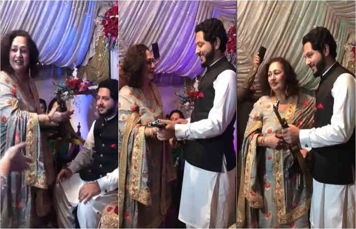 वीडियो में दूल्हा-दुल्हन को एक साथ मंच पर बैठे दिखाया गया है। फिर एक महिला मंच पर आती है और दूल्हे को बधाई और शुभकामनाएं देती है। वह अपने एक साथी से एके -47 असॉल्ट राइफल भी लेता है और दूल्हे को देता है।