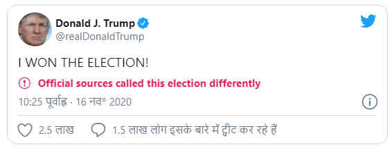 ट्रंप ने एक ट्वीट में कहा कि बिडेन ने केवल नकली समाचार मीडिया की नजर में चुनाव जीता था। मैं किसी के सामने नहीं झुकेगा। हमारी कोशिश जारी रहेगी। इस चुनाव में धांधली हुई और हम जीतेंगे।
