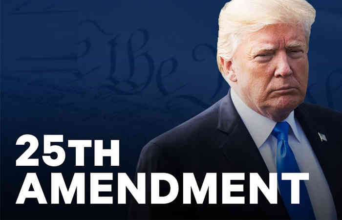 ट्रम्प की अपनी डेमोक्रेटिक पार्टी के सीनेटरों ने भी कथित तौर पर इस कदम के लिए सहमति व्यक्त की क्योंकि गुरुवार की हिंसा ने अमेरिका को दुनिया भर में विवाद में डाल दिया। अब यह जानना दिलचस्प होगा कि संविधान में 25 वां संशोधन क्या है। इस संशोधन को 1967 में अमेरिकी संविधान में जोड़ा गया था। लब्बोलुआब यह है कि अध्यक्ष सही काम करने में विफल रहता है। या अगर वह ऐसा करने में कुशल नहीं है, तो राष्ट्रपति की राष्ट्रपति पद के दौरान मृत्यु हो जाती है या राष्ट्रपति इस्तीफा दे देता है, उपाध्यक्ष को राष्ट्रपति की शक्ति और जिम्मेदारी दी जा सकती है। नए उपराष्ट्रपति का चुनाव करने की शक्ति संसद और राष्ट्रपति द्वारा संयुक्त रूप से निहित थी। इस संशोधन के तहत राष्ट्रपति के काम की जिम्मेदारी राष्ट्रपति के अलावा किसी और को सौंपी जा सकती है।