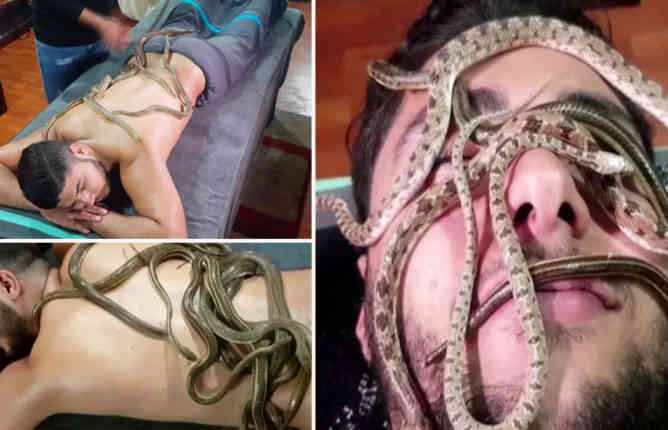 मिस्र के अंदर एक स्पा सेंटर लोगों को एक साँप की मालिश प्रदान करता है। यह दावा किया जाता है कि यह मालिश शरीर को बहुत राहत देती है और सभी प्रकार के दर्द को दूर करती है। स्पा सेंटर मिस्र की राजधानी काहिरा में स्थित है। स्पा में गर्दन प्रकार की मालिश विकल्पों के भीतर एक साँप मालिश विकल्प भी है। सांप की मालिश के दौरान गैर विषैले सांपों का उपयोग किया जाता है।