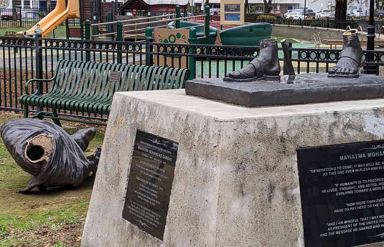 यह वह मूर्ति है जो भारत सरकार द्वारा वर्ष 2016 में डेविस शहर को दी गई थी। यह अधिनियम रात के दौरान एक अजनबी द्वारा किया गया था। जब चौकीदार सुबह पार्क में गया, तो उसने मूर्ति को एक टूटी हुई हालत में देखा। भारत सरकार ने शांति और अहिंसा के दूत महात्मा गांधी की प्रतिमा के इस तरह के व्यवहार की कड़ी निंदा की है। इसी समय, इस घटना ने अमेरिकी मूल के भारतीयों को नाराज कर दिया है।