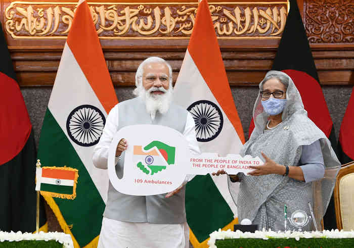 बांग्लादेश की प्रधान मंत्री शेख हसीना के साथ एक बैठक के बाद, प्रधान मंत्री मोदी ने अपनी ina नेबरहुड फर्स्ट ’नीति के तहत शेख हसीना को कोरोना वैक्सीन की 1.5 मिलियन खुराक भेंट की। उन्होंने शेख हसीना को 108 जीवन रक्षक एंबुलेंस भी सौंपी। पीएम मोदी और शेख हसीना ने वीडियो कॉन्फ्रेंस के जरिए ढाका और नई जलपाई गुडी को जोड़ने वाली नई पैसेंजर ट्रेन मिताली पैसेंजर ट्रेन का उद्घाटन किया। दोनों देशों के पास पहले से ही दो ट्रेनें हैं, मैत्री एक्सप्रेस (ढाका से कोलकाता) और बंधन एक्सप्रेस (खुलना से कोलकाता)।