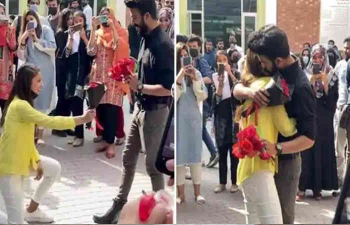 पाकिस्तान के लाहौर विश्वविद्यालय में एक युवती के अपने प्रेमी को अपने घुटनों पर बैठाने और एक-दूसरे को गले लगाने का एक वीडियो वायरल हुआ है।
