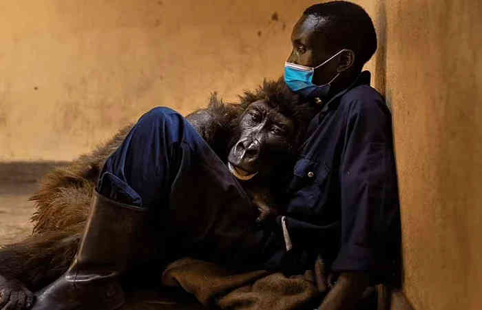 कांगो राष्ट्रीय उद्यान में एक गोरिल्ला ने लंबी बीमारी के बाद अंतिम सांस ली है। उन्होंने अपने केयर टेकर की गोद में शव छोड़ा है। 14 साल पहले उसी केयरटेकर ने उसे बचाया था।