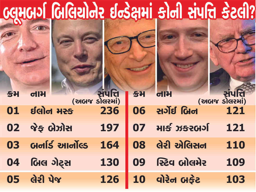 ब्लूमबर्ग अरबपति की सूची में अमेजन के जेफ बेजोस 12 अरब रुपये की संपत्ति के साथ दूसरे स्थान पर हैं। बर्नार्ड अर्नोल्ड 12 अरब के साथ तीसरे, बिल गेट्स 120 अरब के साथ चौथे और लैरी पेज 12 अरब के साथ पांचवें स्थान पर हैं।