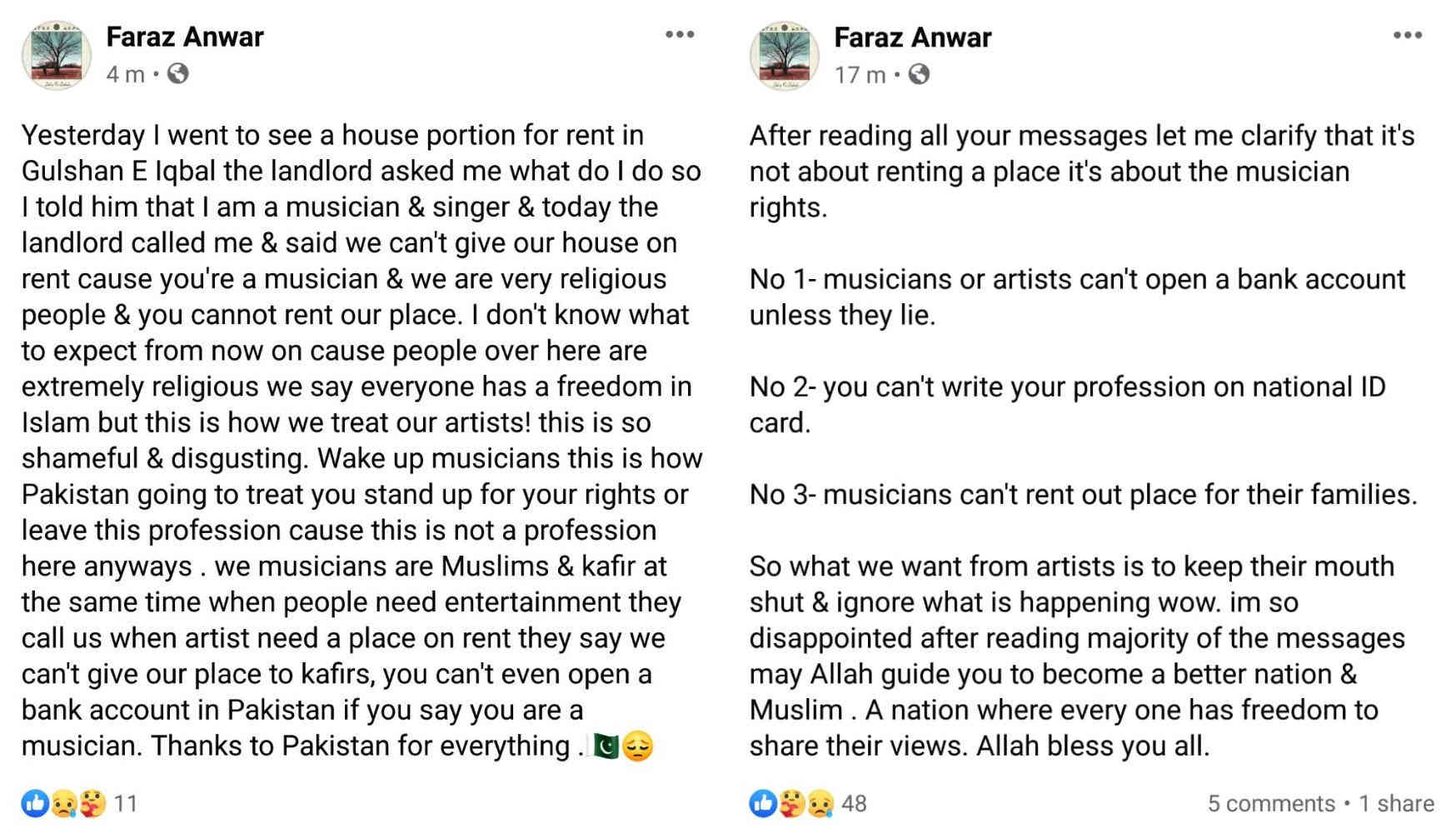फ़राज़ अनवर ने कहा, "मुझे लगता है कि लोग यह नहीं समझते कि कलाकार कैसे काम करते हैं। आज भी लोग सोचते हैं कि संगीत एक साइड बिजनेस है और केवल वही लोग संगीत में शामिल होते हैं जिनके परिवार की आर्थिक स्थिति अच्छी होती है। संगीत कलाकारों के साथ भी भेदभाव किया जाता है। 2005 में मैं एक स्टूडियो बनाना चाहता था लेकिन हम जगह तय नहीं कर सके। हम जहां भी गए, लोग कह रहे थे कि वे बहुत रूढ़िवादी मुसलमान हैं और वे एक संगीत कलाकार को स्टूडियो खोलने की अनुमति नहीं दे सकते। इतना ही नहीं कराची में एक घर लेते समय मुझे ऐसे सवालों का सामना करना पड़ा था।'