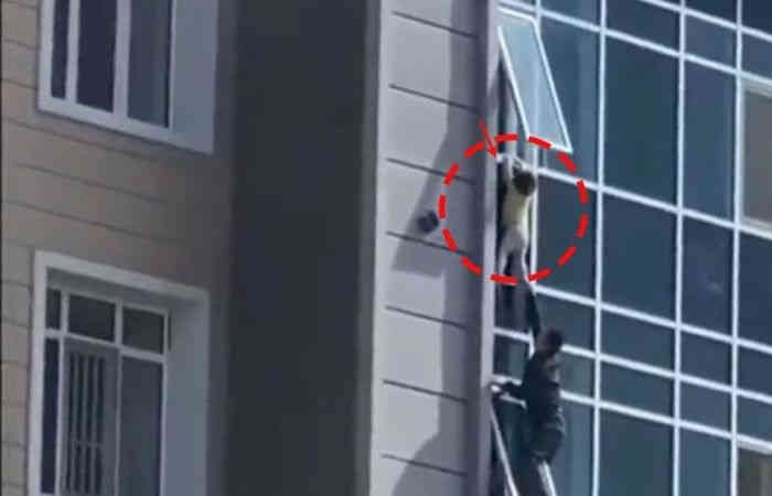शोंटाकाबायेव सबित नाम का एक युवक अपने कार्यालय की ओर जा रहा था तभी उसका ध्यान भीड़ और खिड़की से लटकी लड़की की ओर गया। लड़की खिड़की से लटक रही थी। युवक ने बहादुरी से 3 साल की बच्ची को खिड़की पर लटकी हुई लड़की के नीचे खिड़की से बाहर आकर बचाया और उसे टांगों से पकड़कर खिड़की के अंदर खड़े व्यक्ति को रोक दिया जो आप भी देख सकते हैं वीडियो।