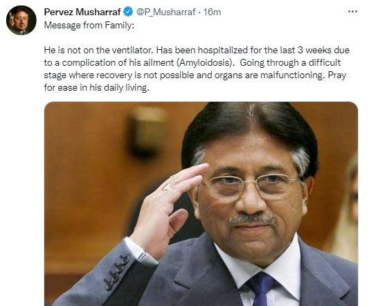 पाकिस्तान के पूर्व राष्ट्रपति परवेज मुशर्रफ पिछले कुछ समय से बीमार चल रहे हैं। उनका दुबई में इलाज चल रहा है। मुशर्रफ 2012 से दुबई में रह रहे हैं। परिजनों ने बताया कि मुशर्रफ की तबीयत खराब हो गई थी। परवेज मुशर्रफ के आधिकारिक ट्विटर अकाउंट से परिवार को संबोधित एक ट्वीट में कहा गया कि पूर्व पाकिस्तानी राष्ट्रपति की हालत गंभीर है। ठीक होने की संभावना नहीं है। ट्वीट में समर्थकों से भी ऐसा ही करने को कहा गया।