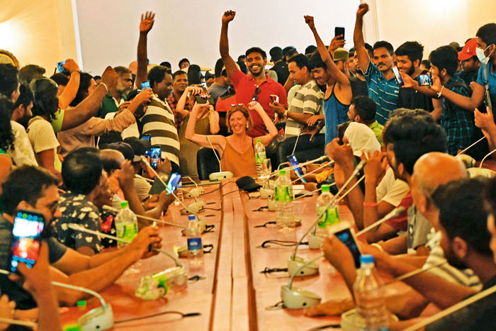 प्रदर्शनकारियों ने द्वीप राष्ट्र की सबसे खराब आर्थिक स्थिति के लिए राजपक्षे परिवार को जिम्मेदार ठहराया और राष्ट्रपति गोटाबाया राजपक्षे के तत्काल इस्तीफे की मांग की। राष्ट्रपति आवास में तोड़फोड़ करने वाले एक प्रदर्शनकारी ने कहा, "जब हमारे घरों में बिजली नहीं होती है तो लोग एसी में सोते हैं।" हजारों प्रदर्शनकारियों ने शनिवार को राष्ट्रपति आवास पर धावा बोल दिया, स्विमिंग पूल में नहाने, बेडरूम में सोने और किचन में नाश्ता करने का लुत्फ उठाया।