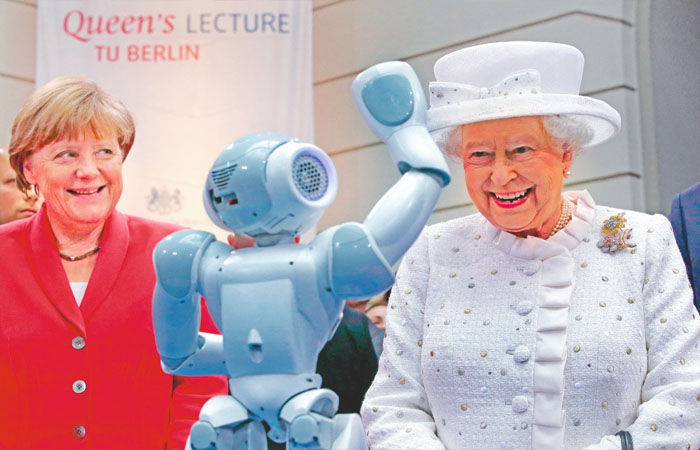 बर्लिन के तकनीकी विश्वविद्यालय में रोबोट के साथ चित्रित ...