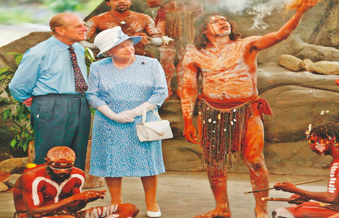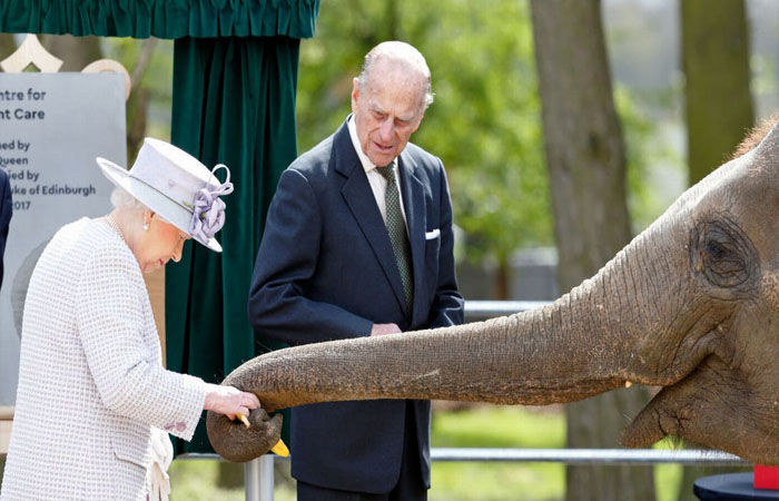 प्रिंस फिलिप और रानी ने हाथी के साथ आराम का समय बिताया।