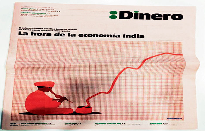 नई दिल्ली: स्पेन के एक अखबार में भारतीय अर्थव्यवस्था को लेकर छपे एक लेख ने बड़ा विवाद खड़ा कर दिया है. स्पैनिश साप्ताहिक 'ला वानगार्डिया' ने भारत की बढ़ती अर्थव्यवस्था पर पहले पन्ने की खबर छापी, जिसमें एक कार्टून में एक मधुमक्खी को बीन बजाते हुए दिखाया गया था और एक सांप को भारत के आर्थिक विकास को दिखाने के लिए एक ग्राफ की तरह अपनी टोकरी से उठता हुआ दिखाया गया था। हालांकि इस कार्टून ने भारत में तहलका मचा दिया है। भारतीयों ने इस कार्टून को यूरोपीय लोगों की रूढ़िवादी मानसिकता बताया है।