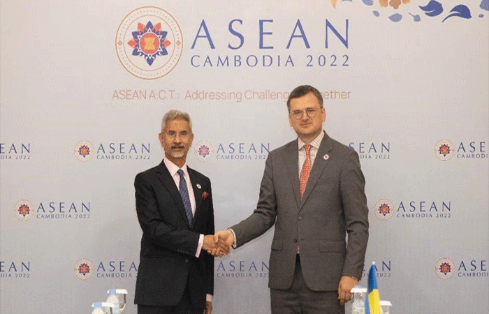 विदेश मंत्री एस. कंबोडिया की राजधानी नोम पेन्ह में आयोजित आसियान-भारत स्मारक शिखर सम्मेलन के दौरान जयशंकर ने यूक्रेन के विदेश मंत्री दिमित्रो कुलेबा से मुलाकात की। दोनों नेताओं ने यूक्रेन युद्ध और परमाणु खतरे सहित विभिन्न मुद्दों पर चर्चा की। जयशंकर ने ट्वीट किया, "हमारी चर्चा में यूक्रेन संघर्ष, वैश्विक खाद्य संकट और परमाणु चिंताओं के बीच अनाज की पहल से संबंधित सभी मुद्दों को शामिल किया गया।" यूक्रेन में जारी युद्ध के बीच रूस द्वारा परमाणु ऊर्जा का उपयोग करने की संभावना के बारे में मीडिया रिपोर्टें सामने आती रहती हैं। हालांकि रूस बार-बार कह चुका है कि वह परमाणु विकल्प का इस्तेमाल नहीं करेगा।