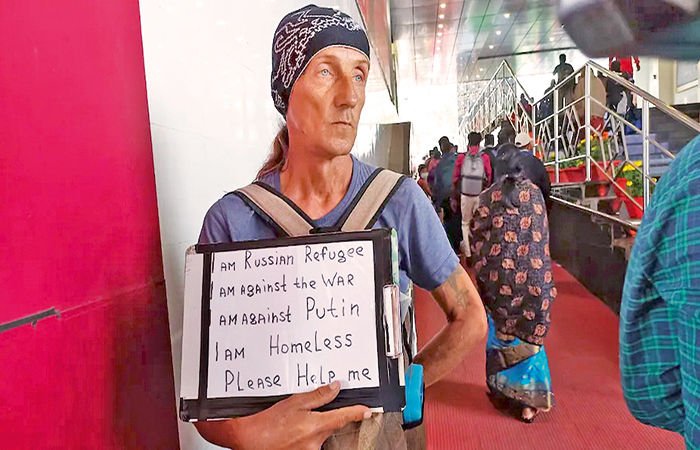 ओडिशा के पुरी के एसपी कंवर विशाल सिंह ने कहा कि एक महीने पहले भुवनेश्वर रेलवे स्टेशन पर एक रूसी नागरिक को देखा गया था, जिसके हाथों में एक तख्ती थी, जिसमें लिखा था, "मैं एक रूसी शरणार्थी हूं और मैं युद्ध के खिलाफ हूं।" मैं भी पुतिन का विरोध करता हूं, मैं बेघर हूं, कृपया मेरी मदद करें।