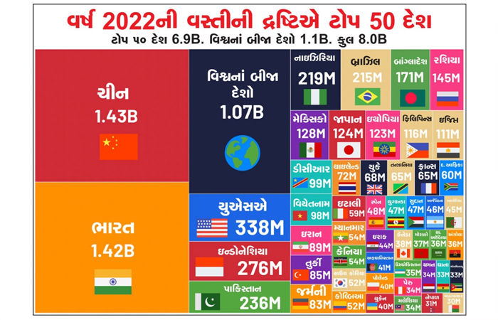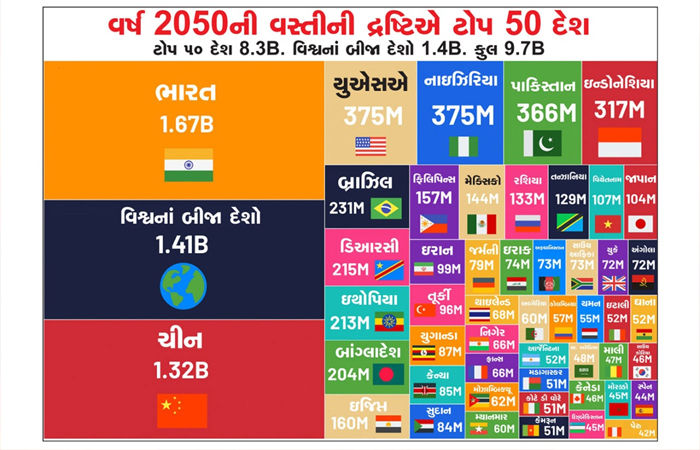 इस चार्ट के अनुसार, वर्तमान में सबसे अधिक जनसंख्या वाला देश चीन है, लेकिन वर्ष 2050 के संभावित चार्ट के अनुसार, भारत की जनसंख्या दुनिया में सबसे अधिक होने की संभावना है। हालांकि, इस साल भी भारत और चीन की आबादी में ज्यादा अंतर नहीं है। इसके अलावा अमेरिका, पाकिस्तान, इंडोनेशिया, ब्राजील और नाइजीरिया भी सबसे ज्यादा आबादी वाले देशों में शामिल हैं। यह चार्ट केवल शीर्ष 50 देशों की जनसंख्या को दर्शाता है। यह कोई चार्ट नहीं बल्कि एक चेतावनी है।